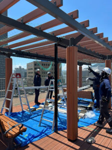 生地を切り(断裁)繋げ(溶着)縫って(縫製)、取付け施工します。